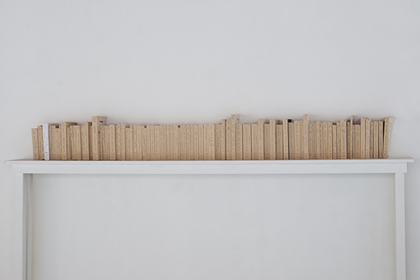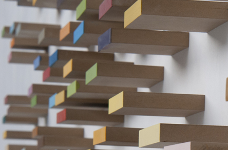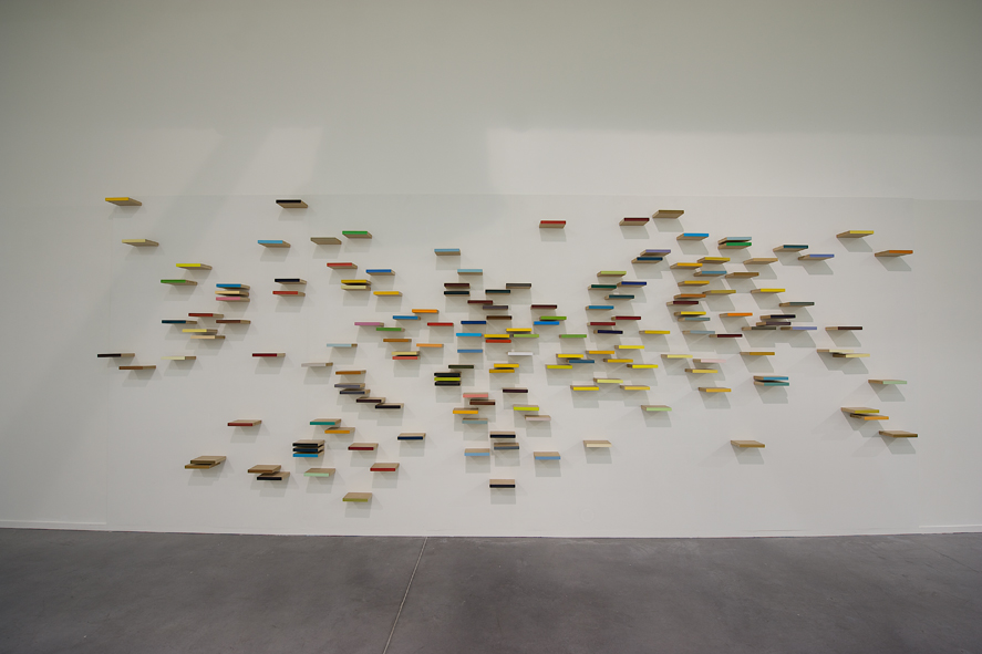 - Un mur de 6m x 2.5m, recouvert de 164 volumes en bois, qui représentaient les 164 premières lectures. Chaque volume était accroché à l'horizontale, comme une petite étagère et ne portait comme seule indication que la couleur que je lui associait par synesthésie. Les livres étaient agencés en constellation et placés les uns par rapport aux autres en suivant le souvenir subjectif de chaque lecture.