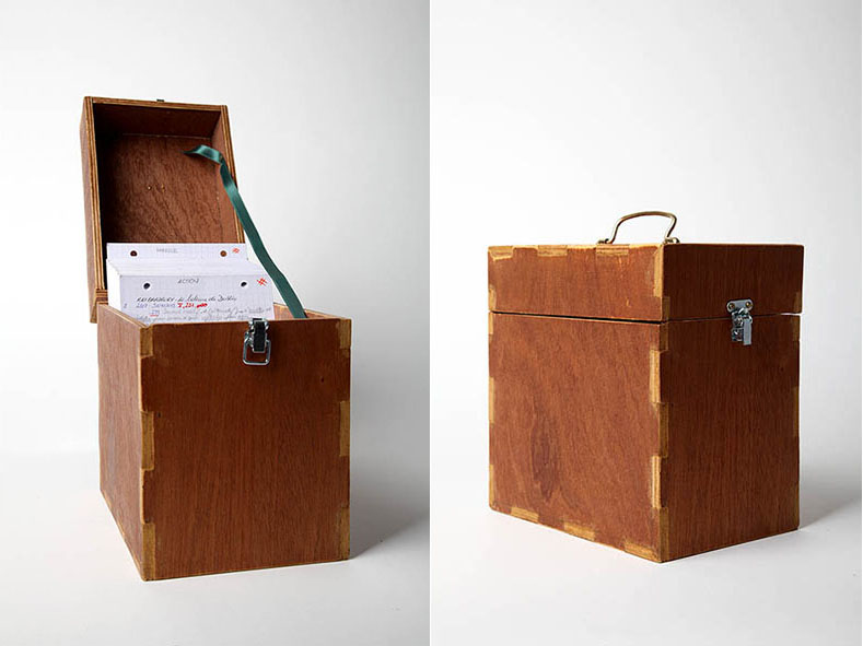 Le coffret a été réalisé par Chloé. Il est beau et il mesure 21,5cm x 14cm x 22cm. contient environ 250 fiches bristol et il