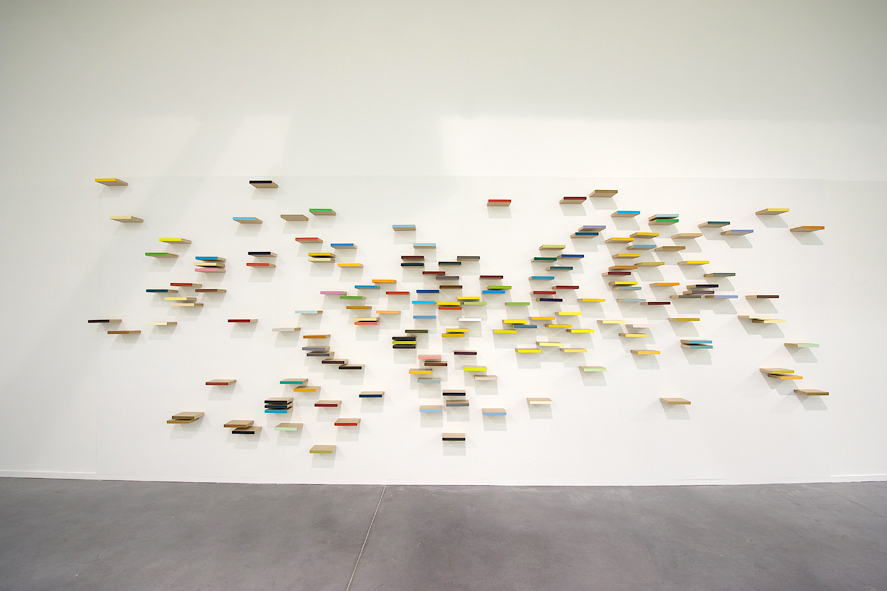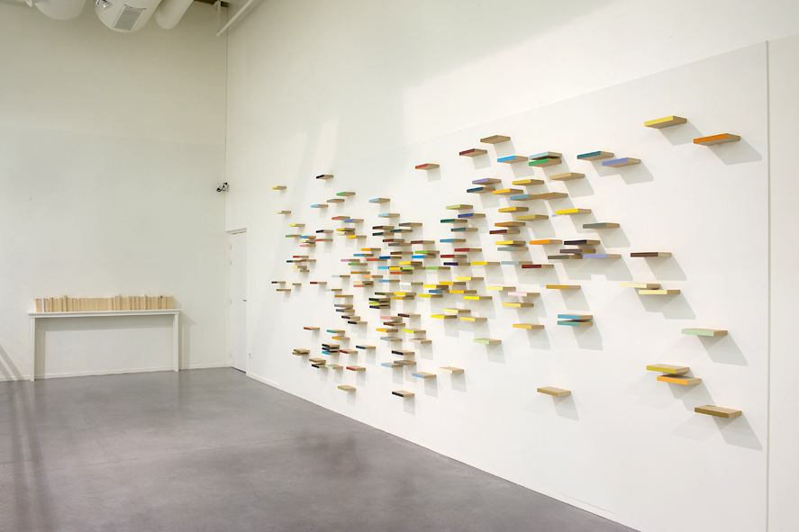 Constellation est une représentation spatiale de la lecture. Chaque volume de bois porte une couleur singulière, synthèse sensible du souvenir du livre.